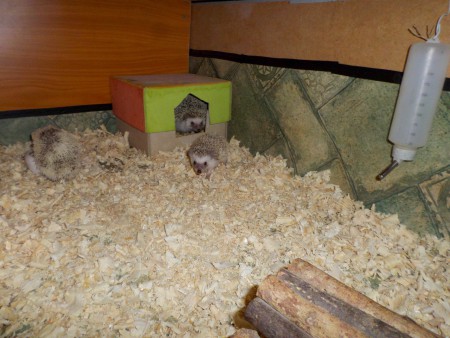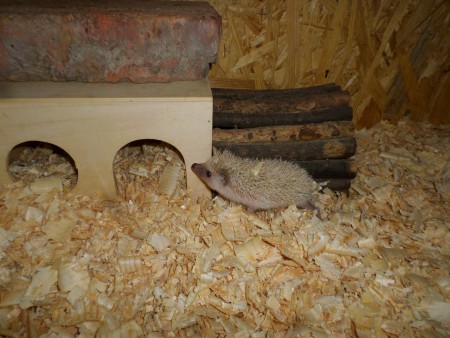 Az állataim egy faházban élnek, ami ősztől tavaszig fűtve van. A sünik 120 x 80 cm alapterületű, 50 cm belmagasságú, egyedileg tervezett, saját építésű helyeken laknak.